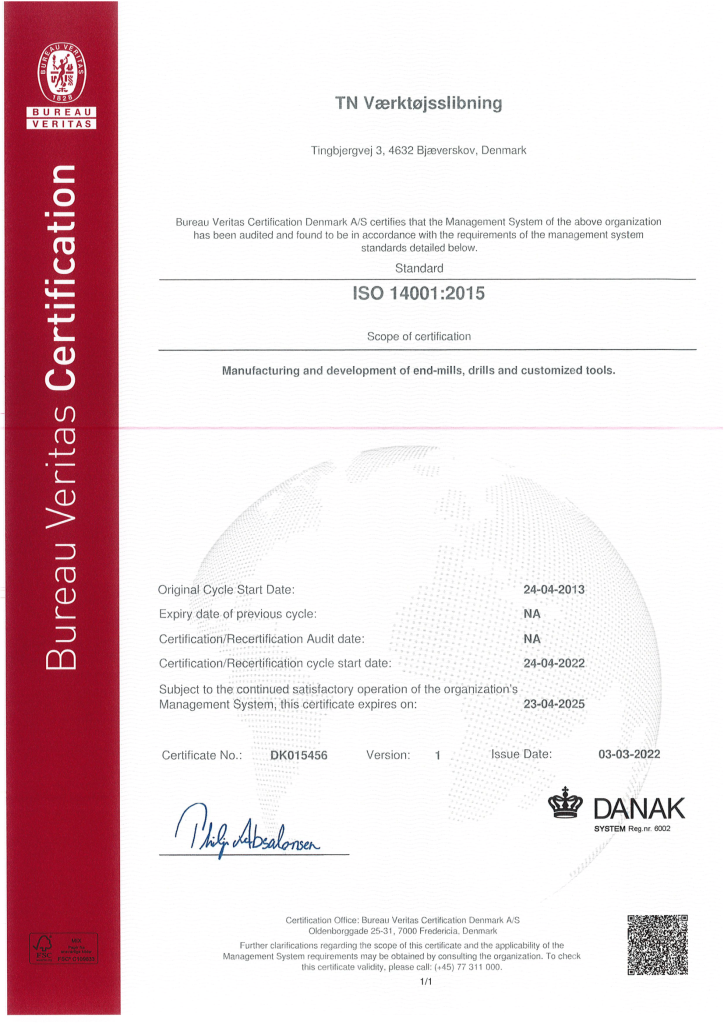 In May 2011, TN was ISO9001 certified by Bureau Veritas. This was a major review of the entire company which was to enter into new routines and registrations. But at the same time it has helped for a more uniform process and traceability throughout the entire TN tool grinding. In April 2013, TN was ISO14001 certified by Bureau Veritas, it was part of our environmental policy.