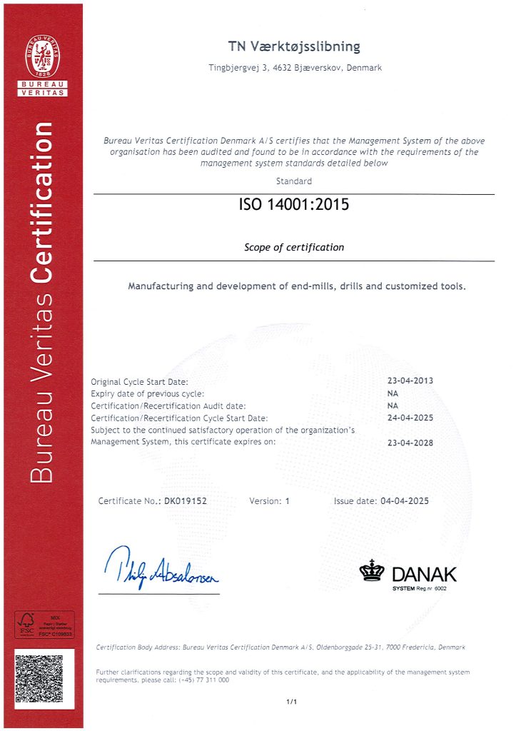 Dette var en større gennemgang af hele virksomheden som skulle ind i nye rutiner og registreringer. Men det har samtidig hjulpet til en mere ensartig process og sporbarhed igennem hele TN tools. I april 2013, blev TN ISO14001 certificeret hos Bureau Veritas, det var et led i vores miljøpolitik.