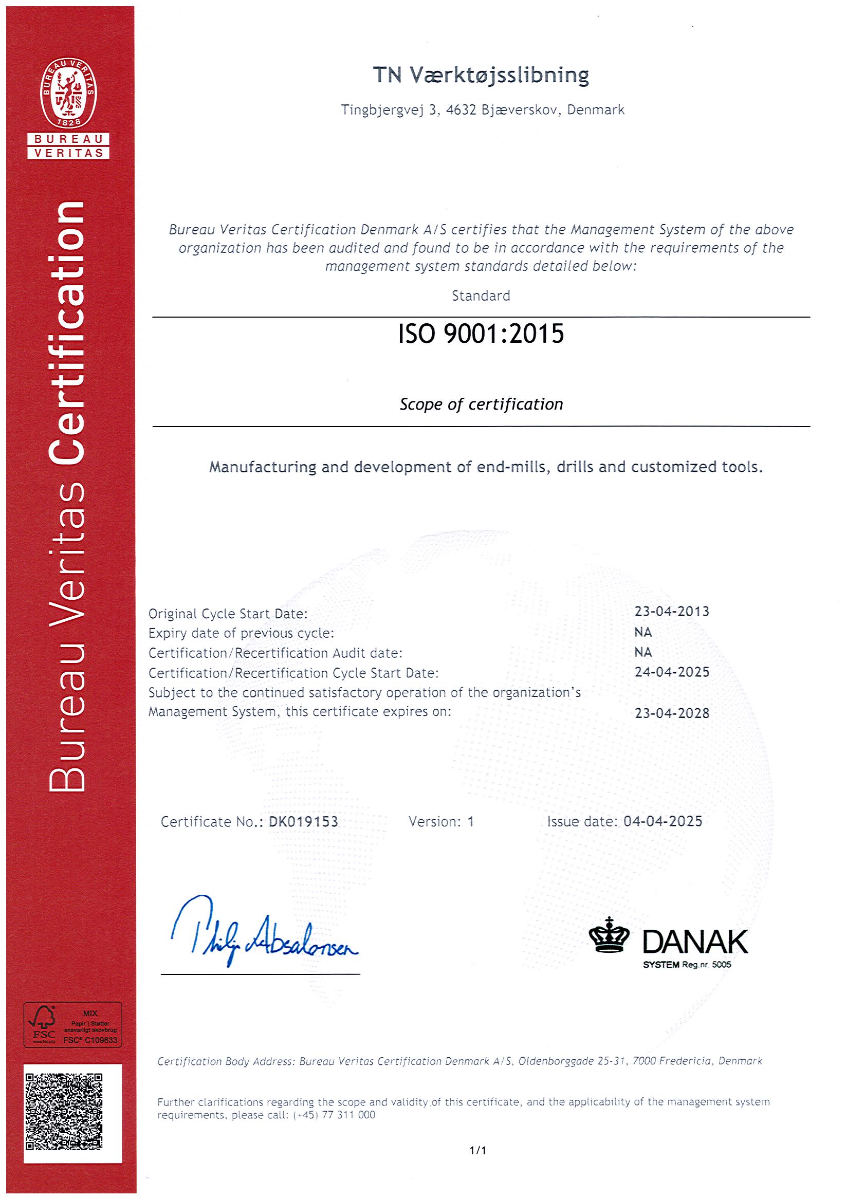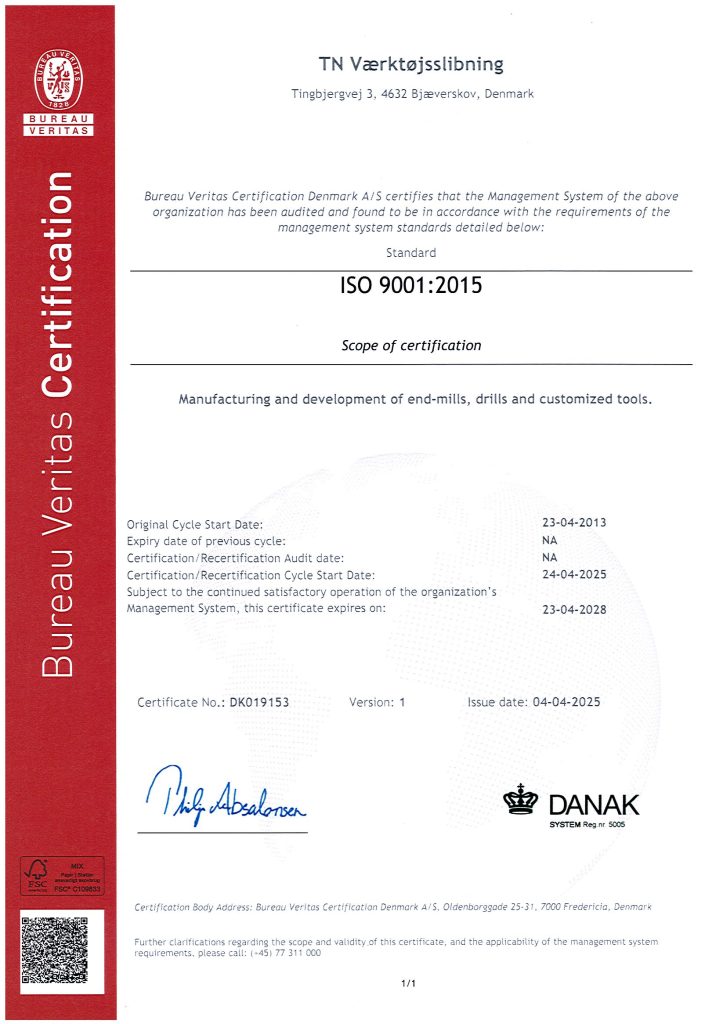 Som et led i forbedringer, er TN tools henholdsvis blevet ISO9001 % ISO14001 certificeret. Certificeringerne og audit heraf, sker løbende og i takt med de krav som bliver imødeset af kunder. I maj 2011, blev TN ISO9001 certificeret hos Bureau Veritas.